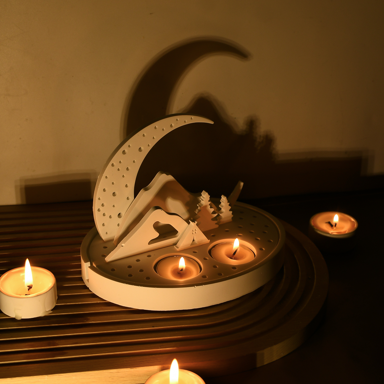 Transform your space into a peaceful mountain retreat with this charming candle holder. In the exquisitely carved mountain scenery like an artist, dotted with twinkling stars, below is a crescent shaped full moon. This thoughtful design can accommodate candles, which emit warm and enticing light, creating enchanting shadows through complex hollow details. The sturdy structure includes a circular base with perfectly sized openings, suitable for standard blue-green candles, while the 3D scene adds depth and visual fun. Very suitable for creating a warm atmosphere in the living room or bedroom, or as a striking centerpiece decoration in special occasions. The pure white appearance matches any decorative style, from rural to modern, making it a versatile decoration. After lighting up, it becomes a charming display, bringing the essence of peaceful mountain nights under the moonlight into the home